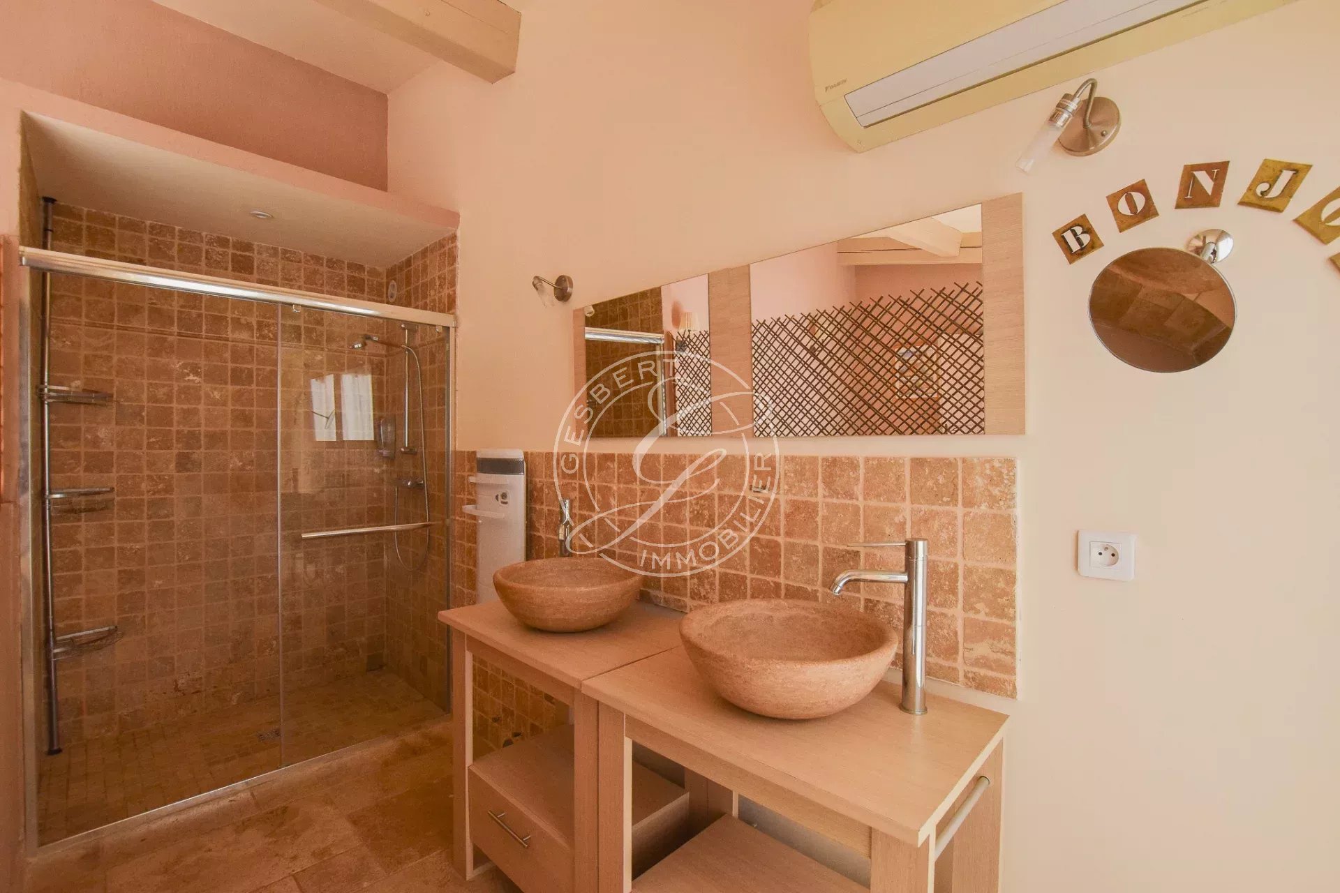 Les extérieurs sont un véritable écrin de détente, avec une piscine de forme libre entourée de nombreuses terrasses, un cabanon en pierre, un abri jardin, un carport et un terrain de pétanque, le tout s’intégrant harmonieusement aux espaces de vie extérieurs. L’arrosage automatique, le portail motorisé, la climatisation réversible et une cave à vin totalement typique de l’ancienne bergerie viennent parfaire l’ensemble.