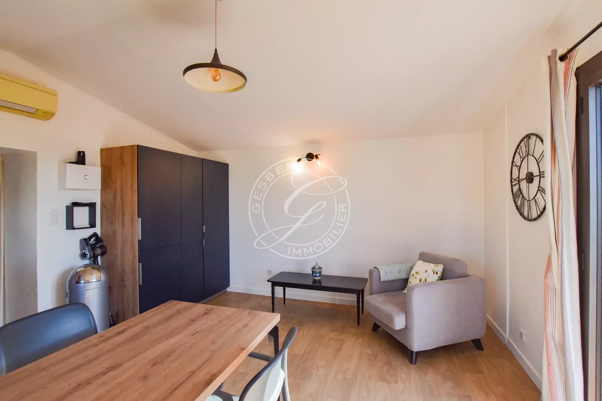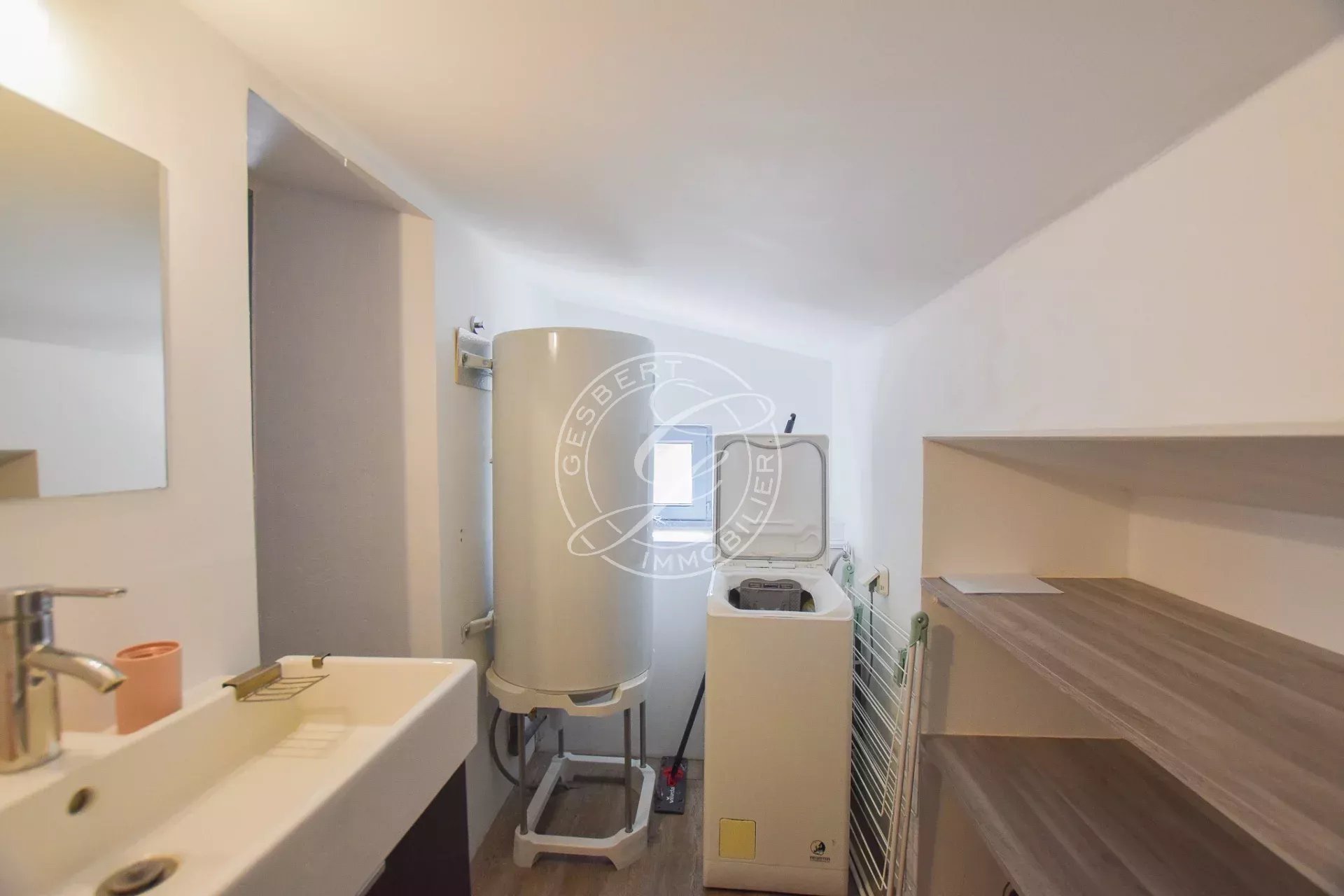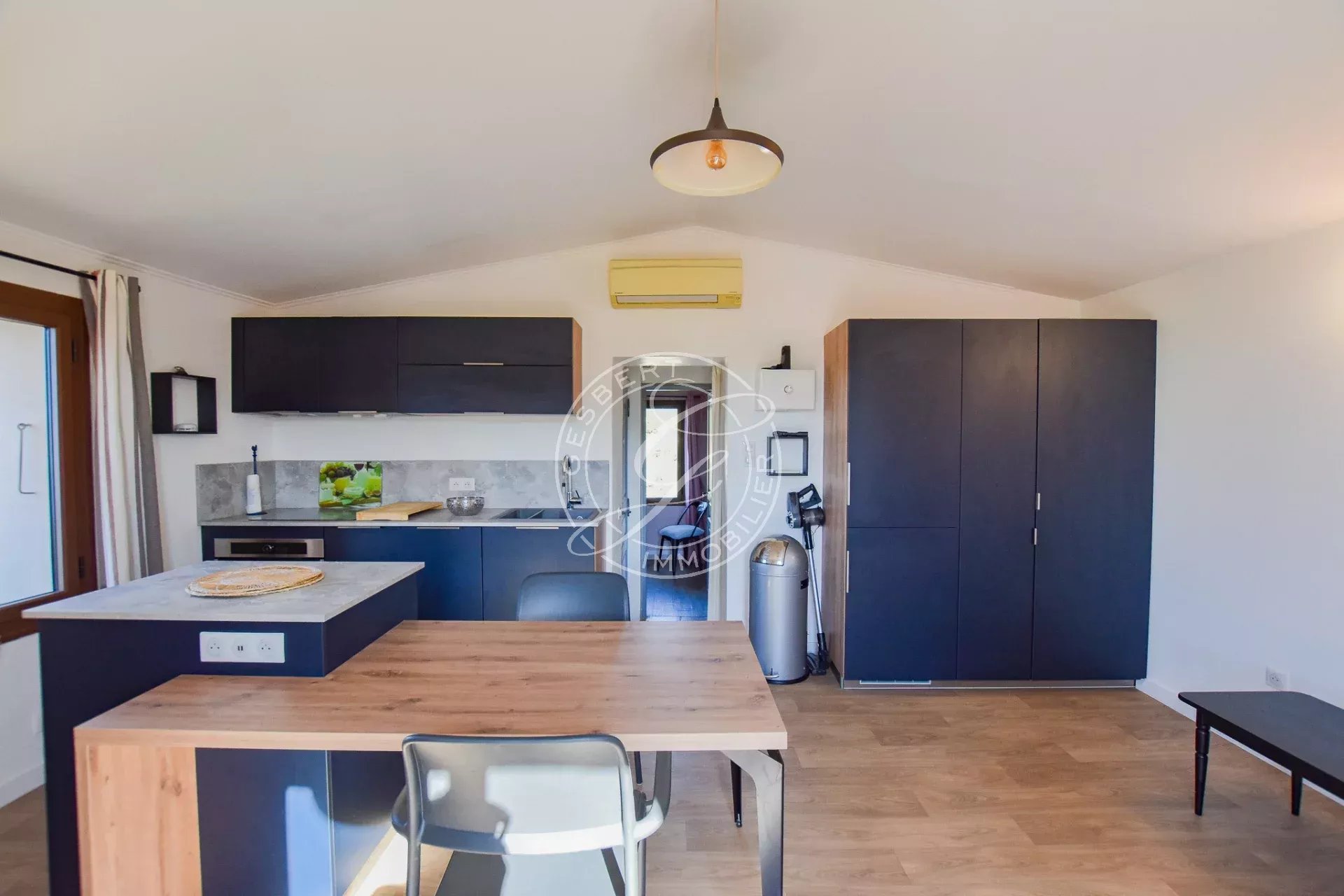 L’étage propose une dépendance accessible depuis l’intérieur de la maison ou directement depuis l’extérieur. Elle se compose d’une cuisine américaine aménagée, d’un salon-séjour, d’une chambre avec salle d’eau et toilettes, ainsi que d’une salle de bain avec baignoire balnéo et d’un espace buanderie.