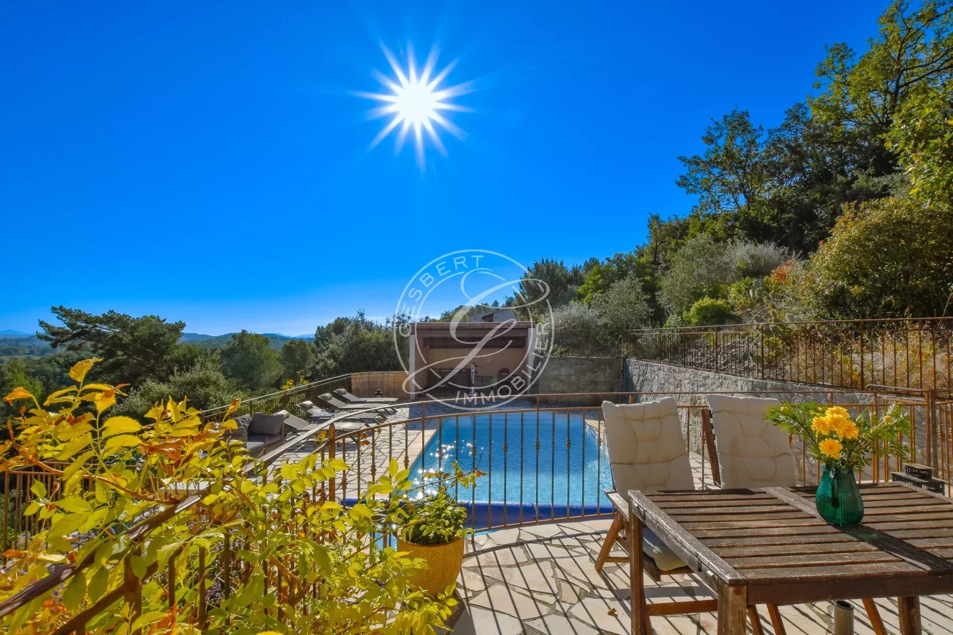 Les extérieurs, soignés accueillent naturellement un bel espace piscine (8 × 4 m) bordé de terrasses, un pool house de 16 m² et un garage de 17 m². Le terrain de 2 605 m², en partie pentu, préserve la vue et l’intimité du lieu.