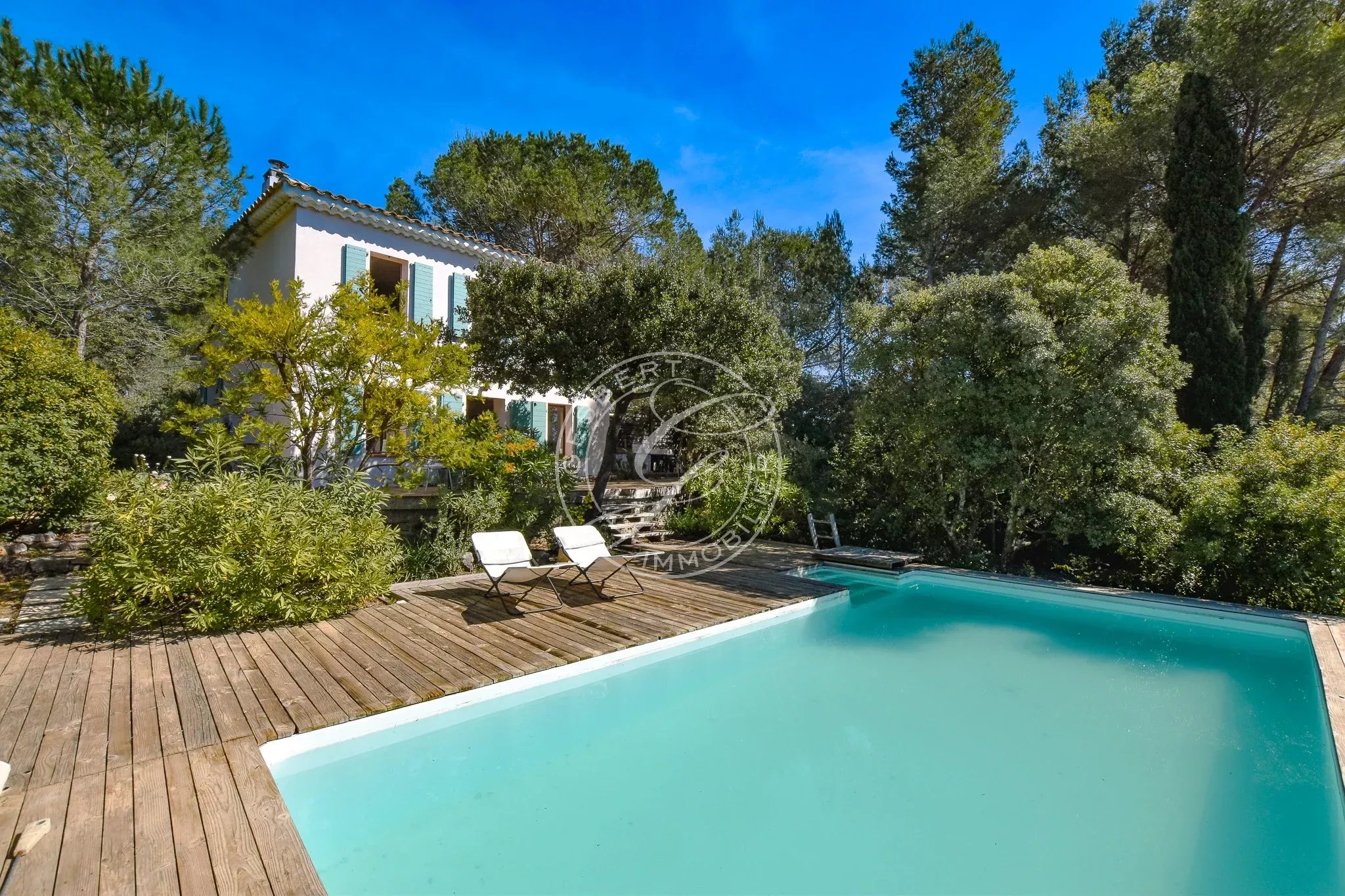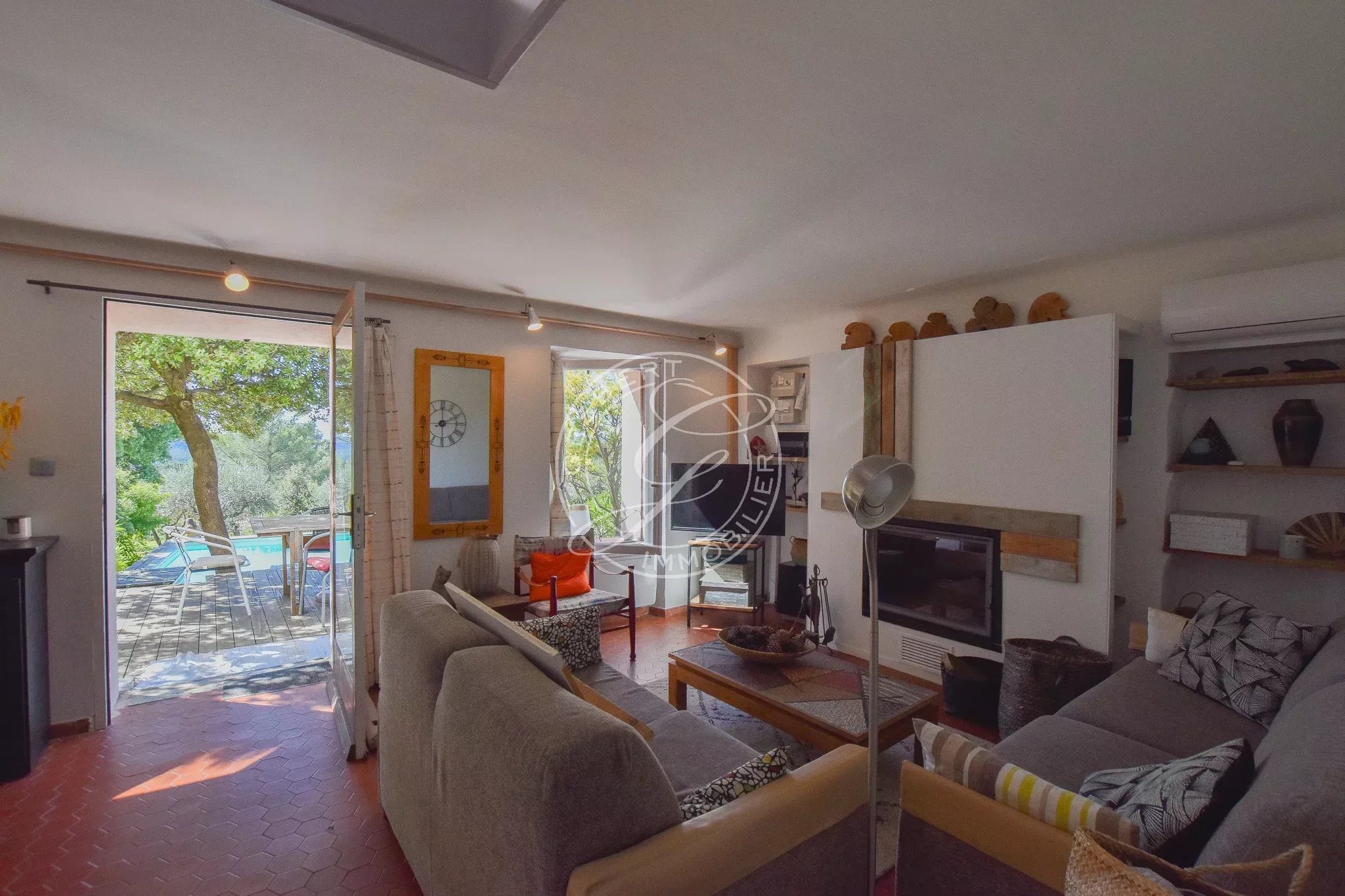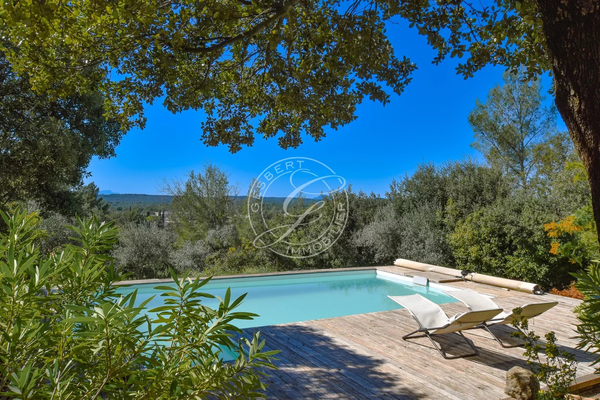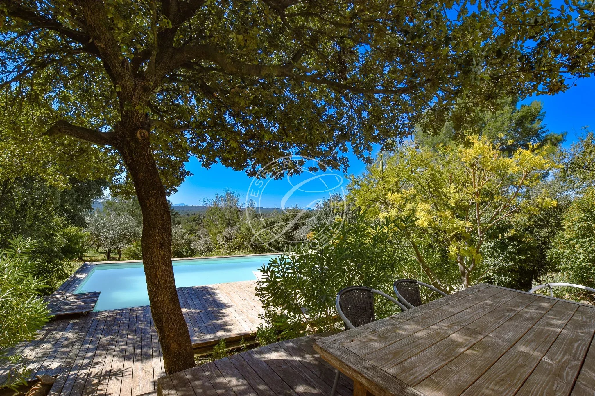 En rez-de-jardin, accessible par quelques marches, vous découvrirez une très belle pièce de vie lumineuse comprenant un salon-séjour chaleureux, ouvert sur une agréable terrasse en bois, véritable prolongement de l’espace intérieur, depuis laquelle la vue panoramique sur les collines et le Grand Bessillon est tout simplement spectaculaire et confère au lieu un caractère exceptionnel.