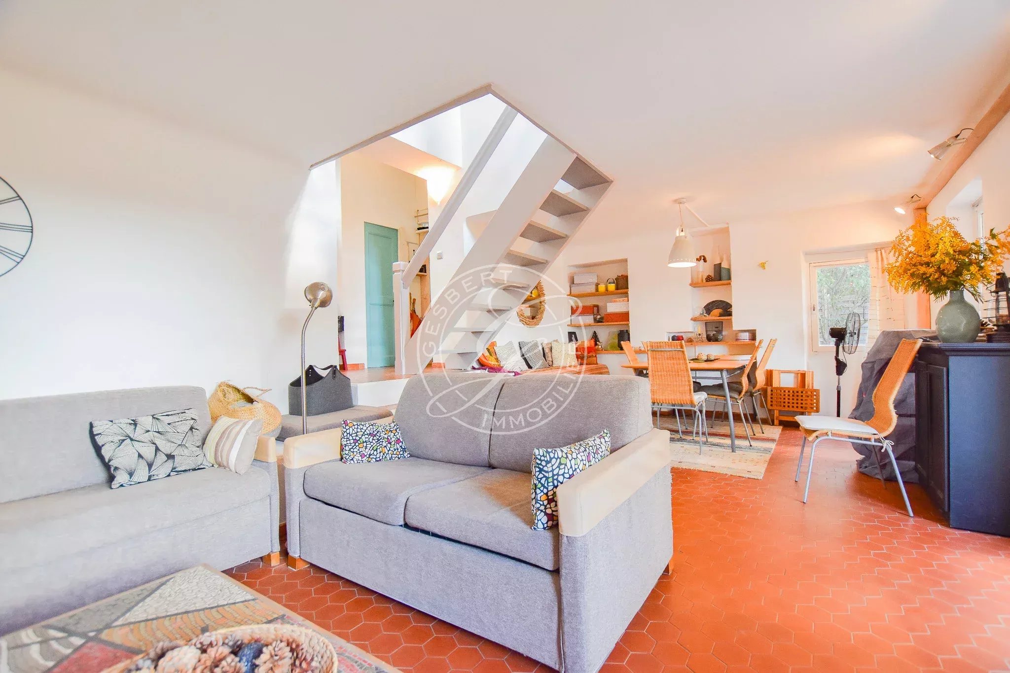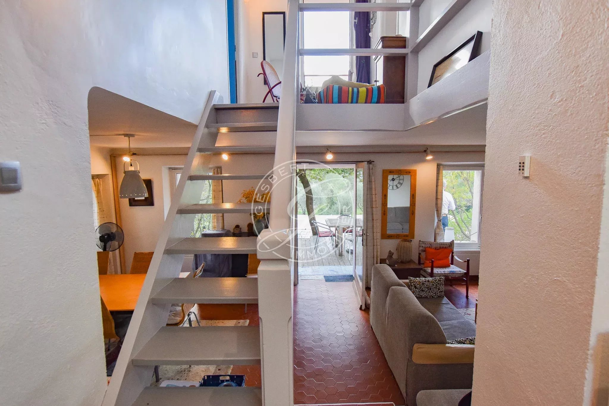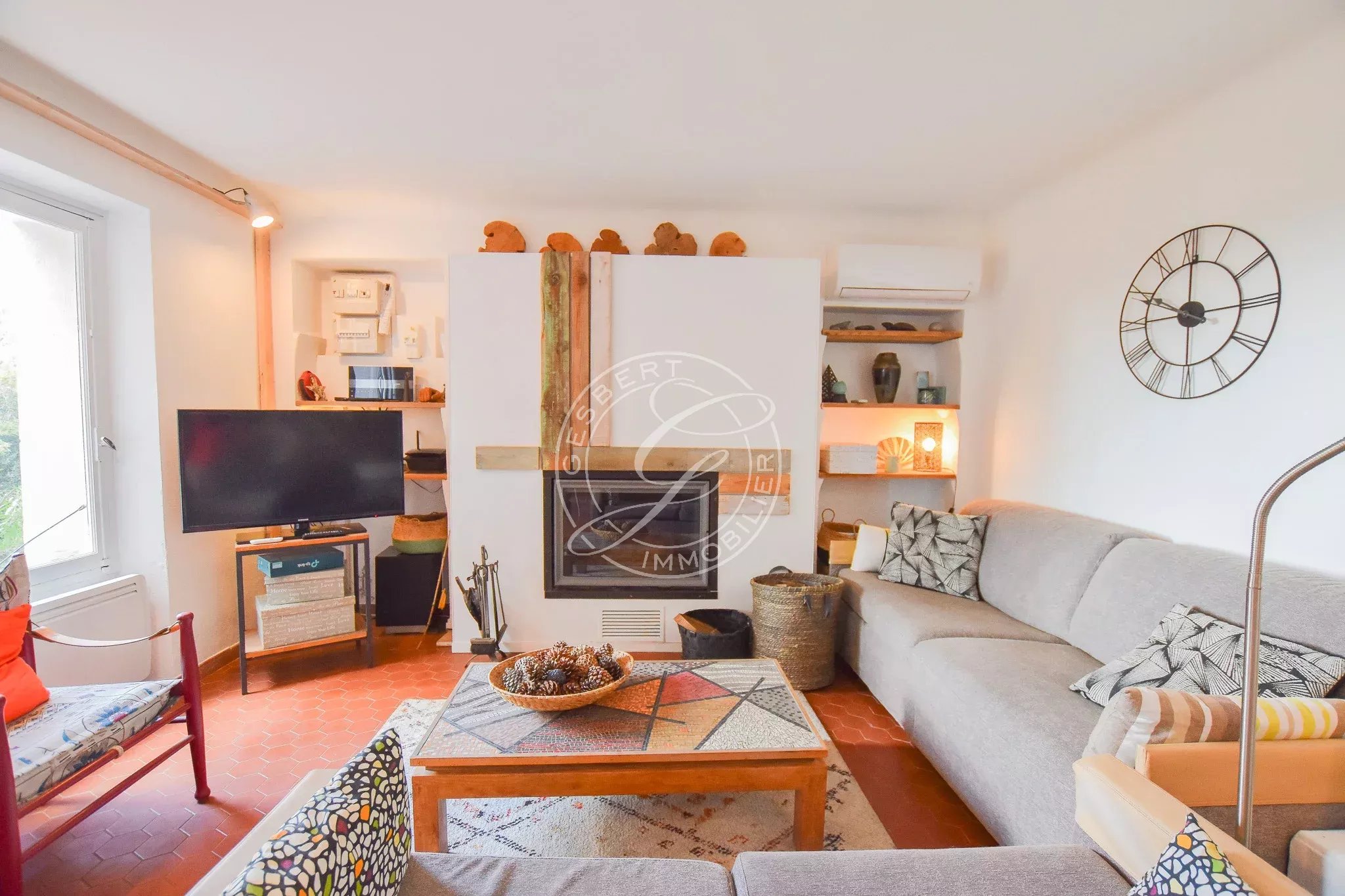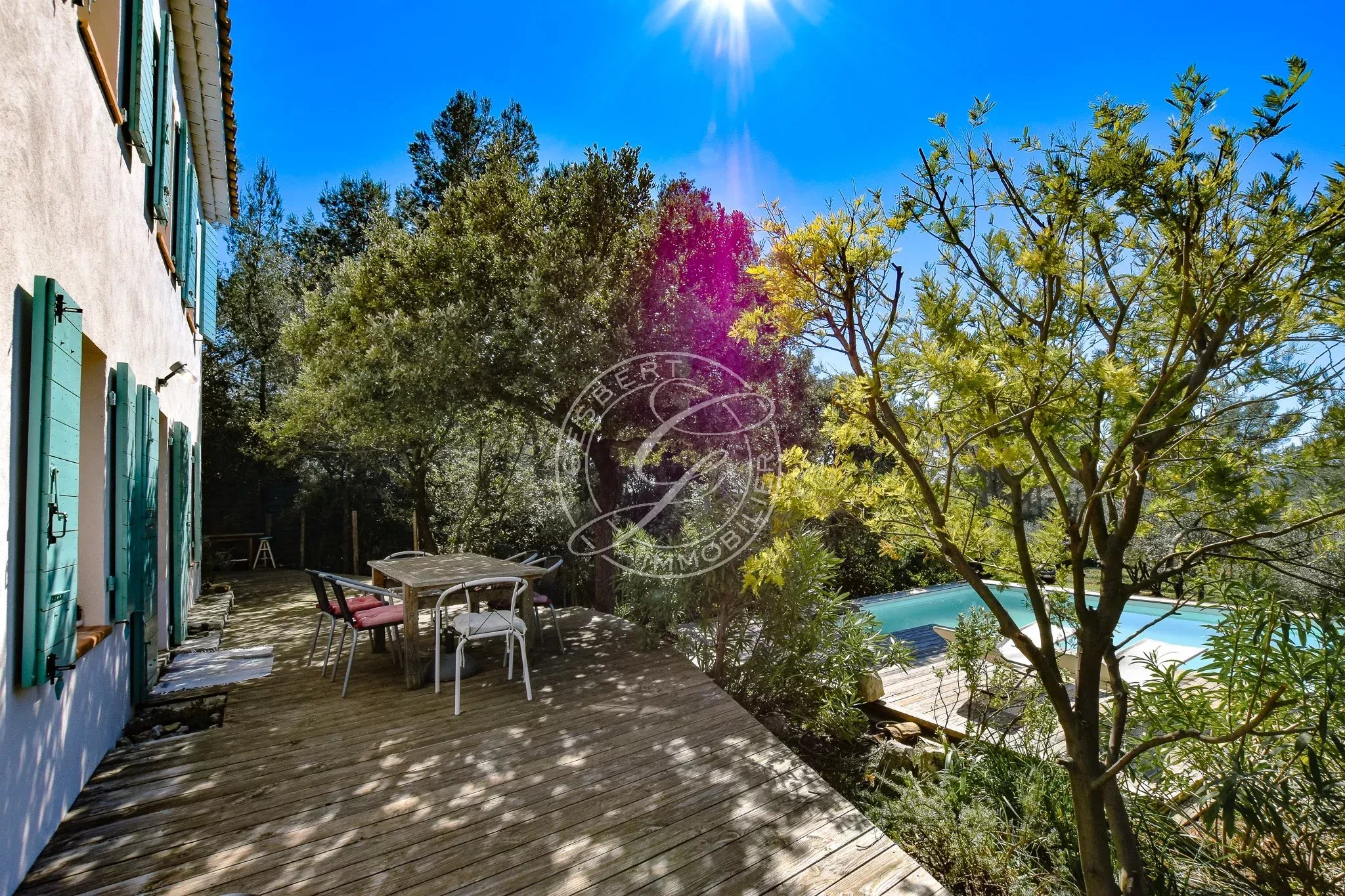 En rez-de-jardin, accessible par quelques marches, vous découvrirez une très belle pièce de vie lumineuse comprenant un salon-séjour chaleureux, ouvert sur une agréable terrasse en bois, véritable prolongement de l’espace intérieur, depuis laquelle la vue panoramique sur les collines et le Grand Bessillon est tout simplement spectaculaire et confère au lieu un caractère exceptionnel.