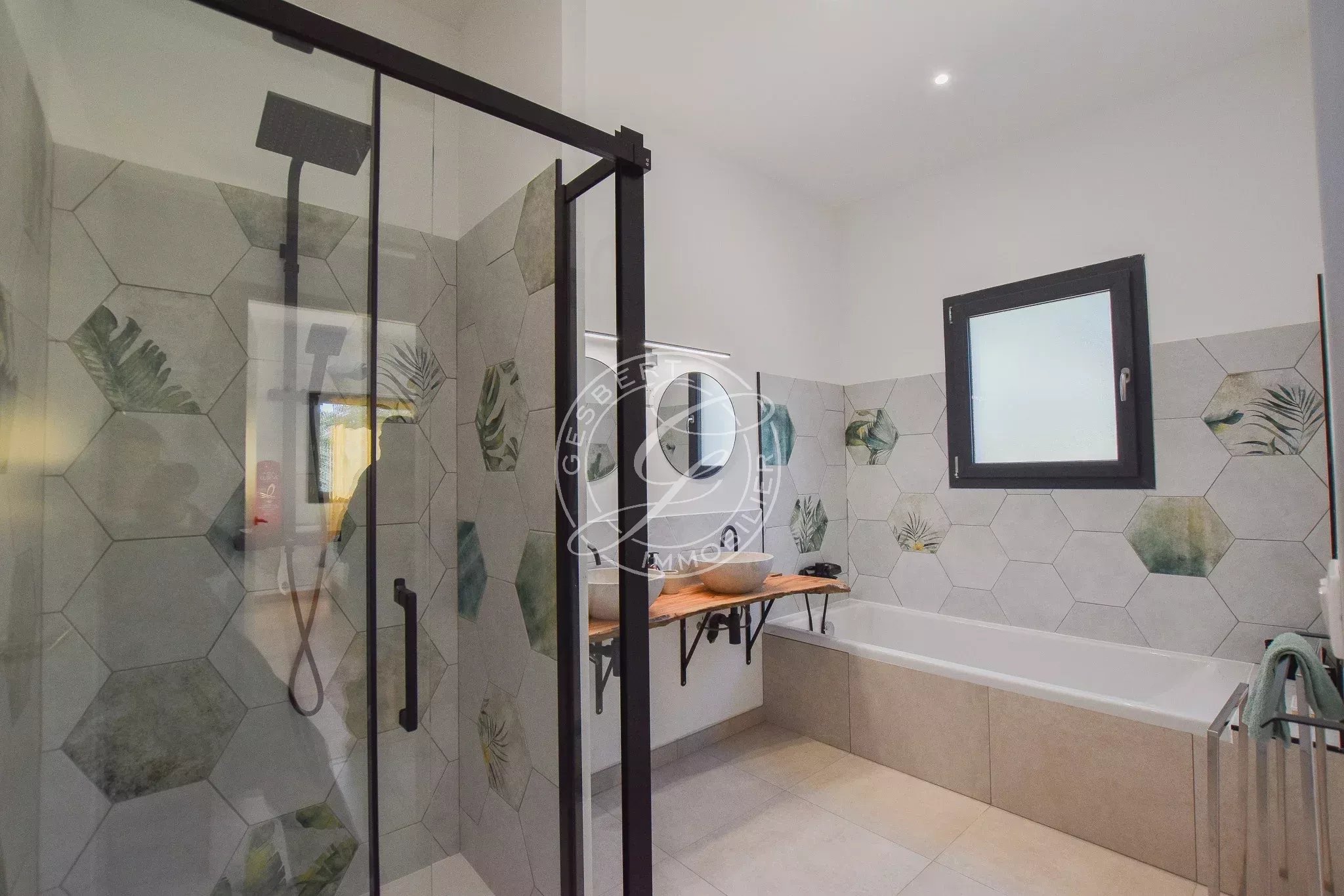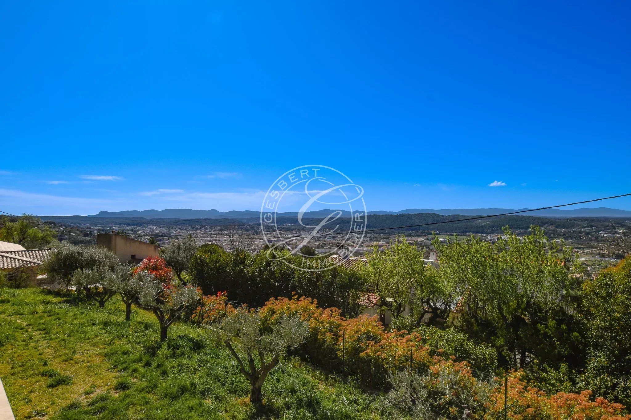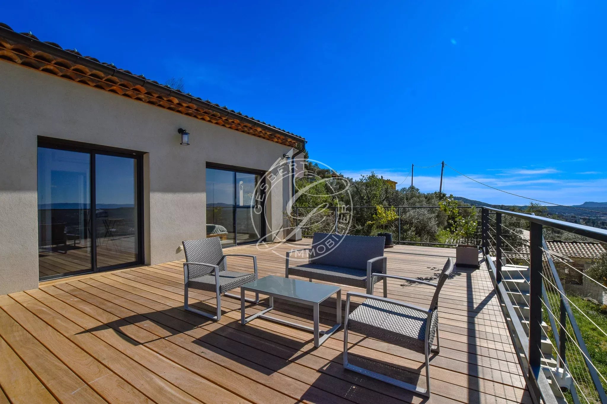 A VENDRE DRAGUIGNAN - Au coeur d'une ancienne oliveraie, superbe villa récente en position dominante avec vue panoramique jusqu'au massif des Maures, offrant deux parties distinctes pouvant être reliées pour une créer une seule habitation.