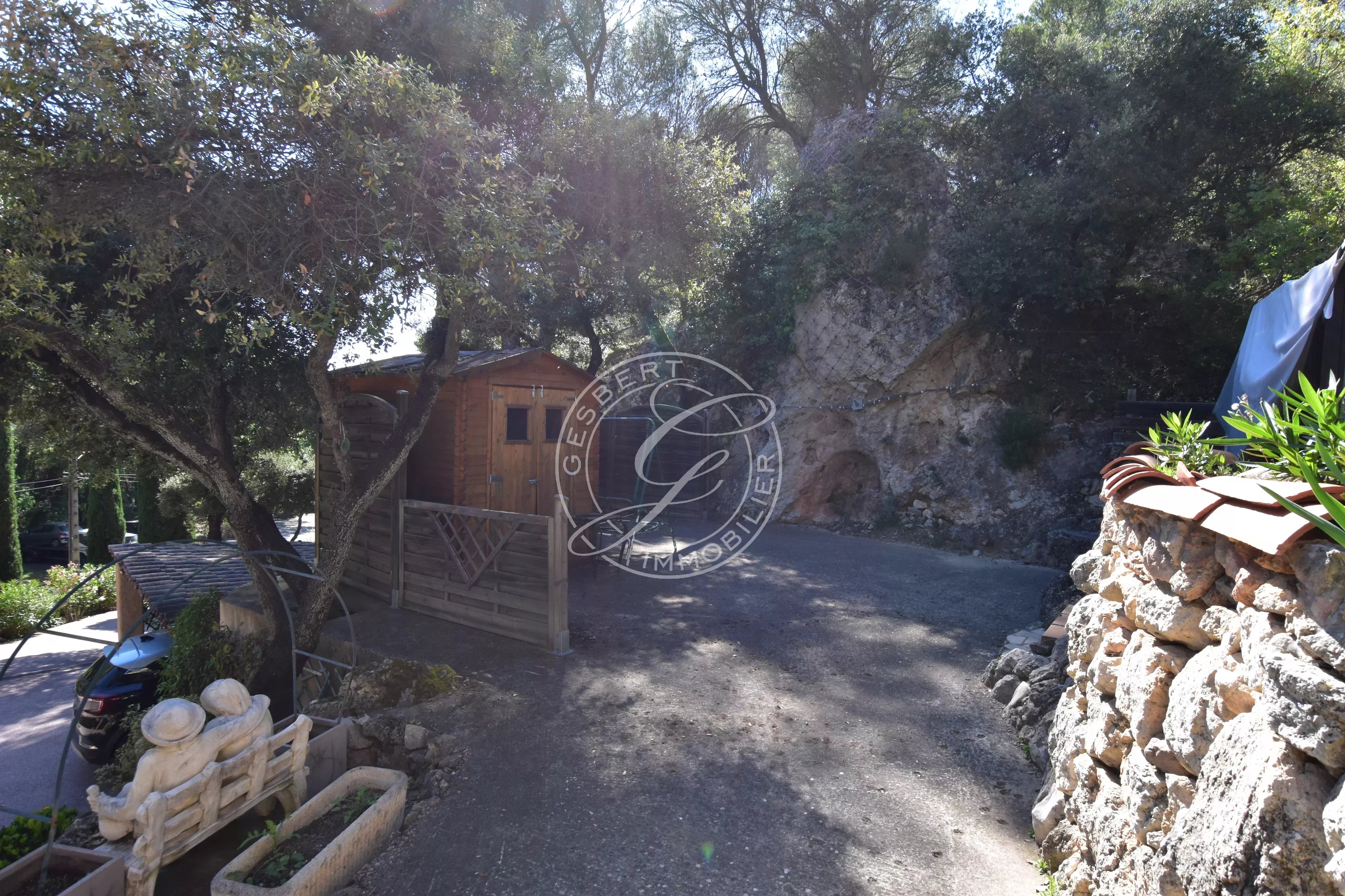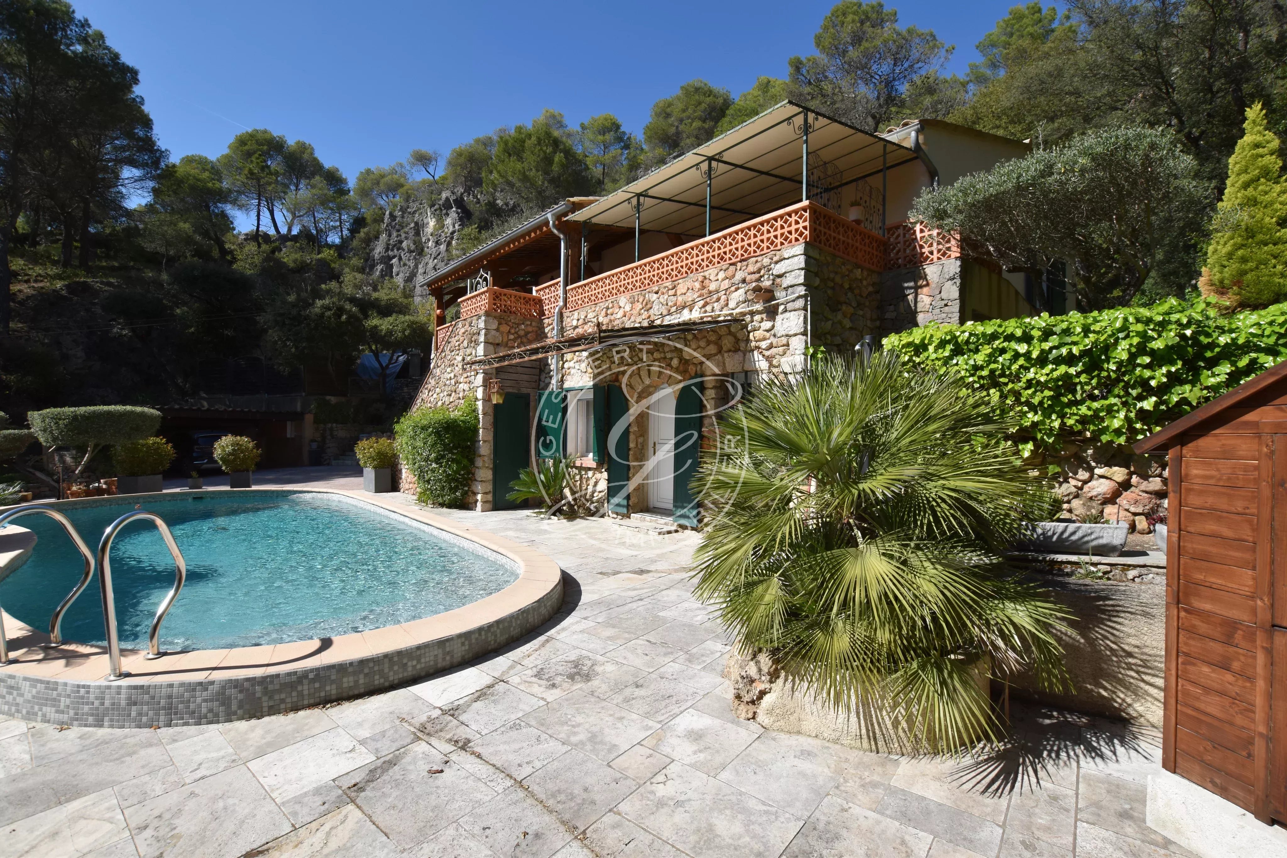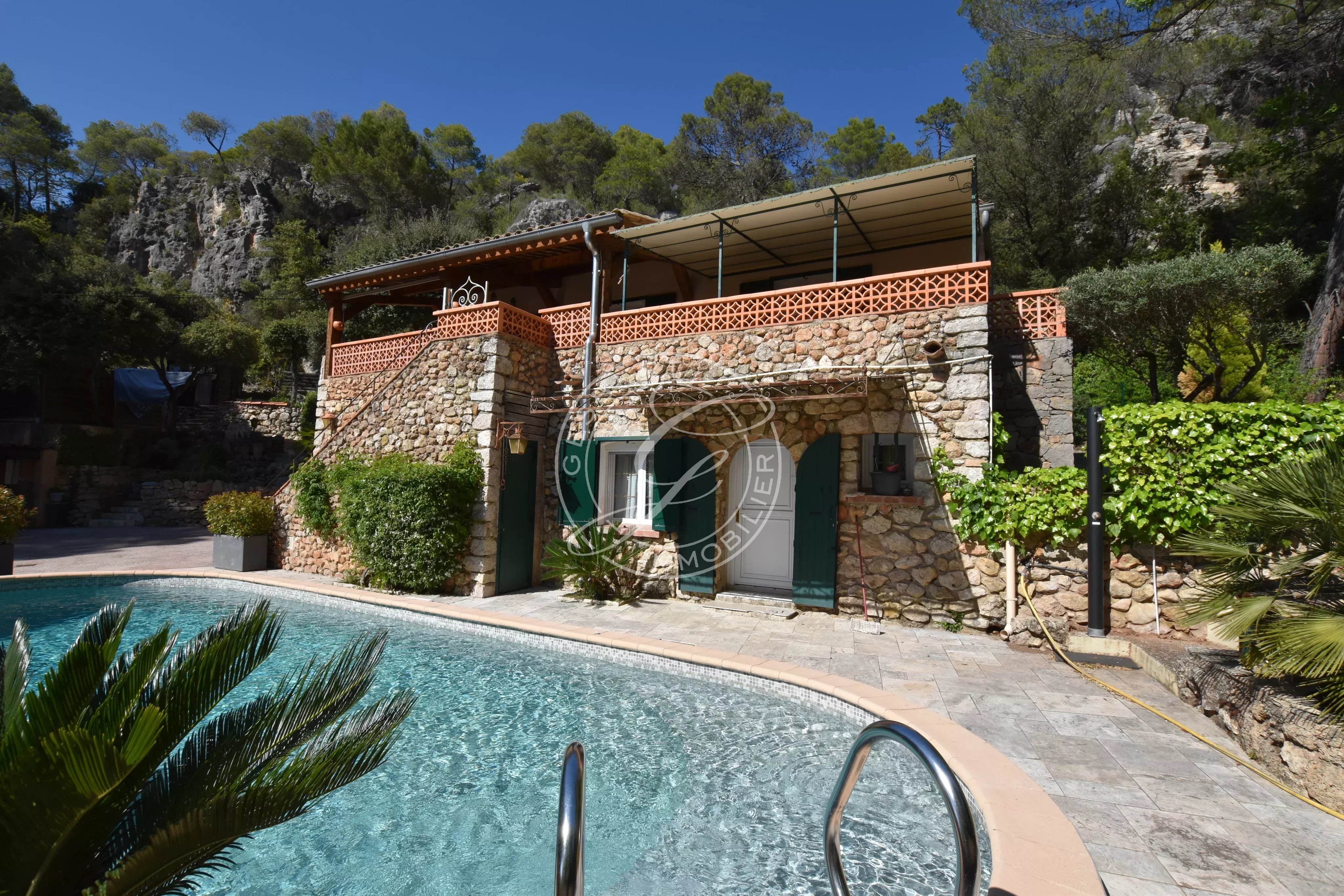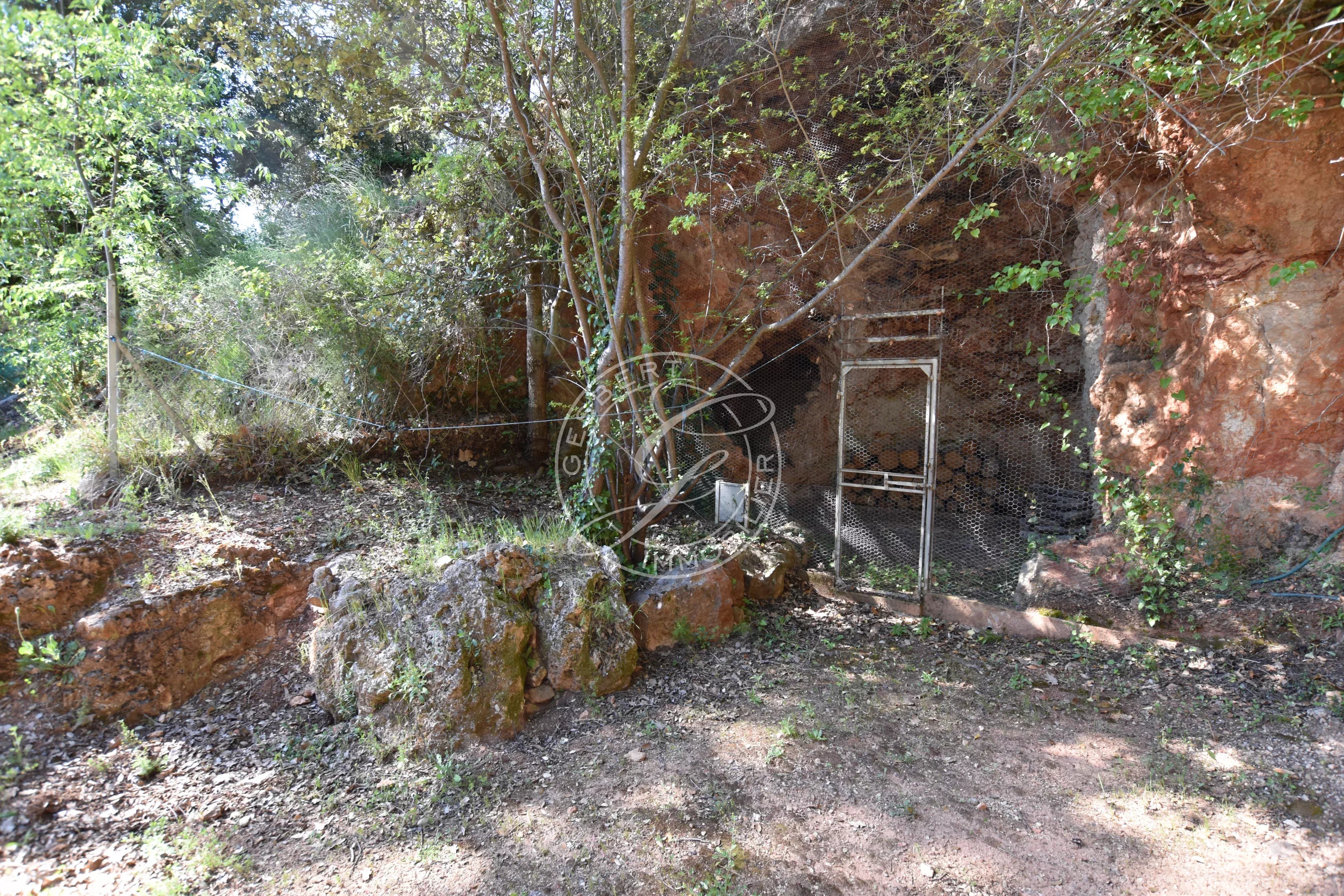 Une piscine traditionnelle en mosaïque, de forme libre, s’intègre parfaitement dans ce décor naturel, accompagnée de son pool house, de plusieurs espaces de rangement fermés, d'un espace de bricolage, d’un cabanon en bois et d’une étonnante grotte aménagée pouvant accueillir différents projets. Un local technique ainsi qu’un espace de détente en contrebas viennent parfaire cet ensemble.