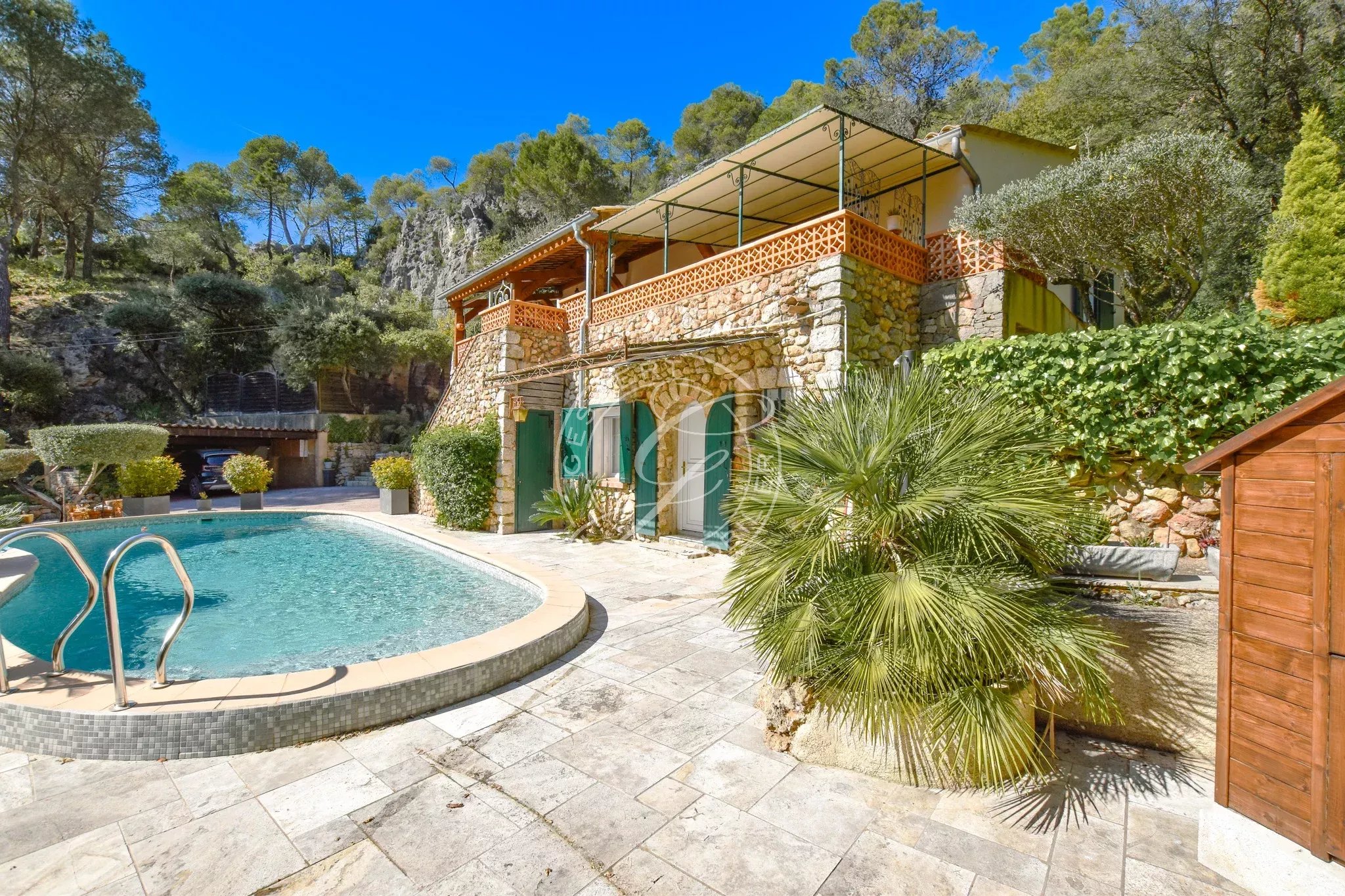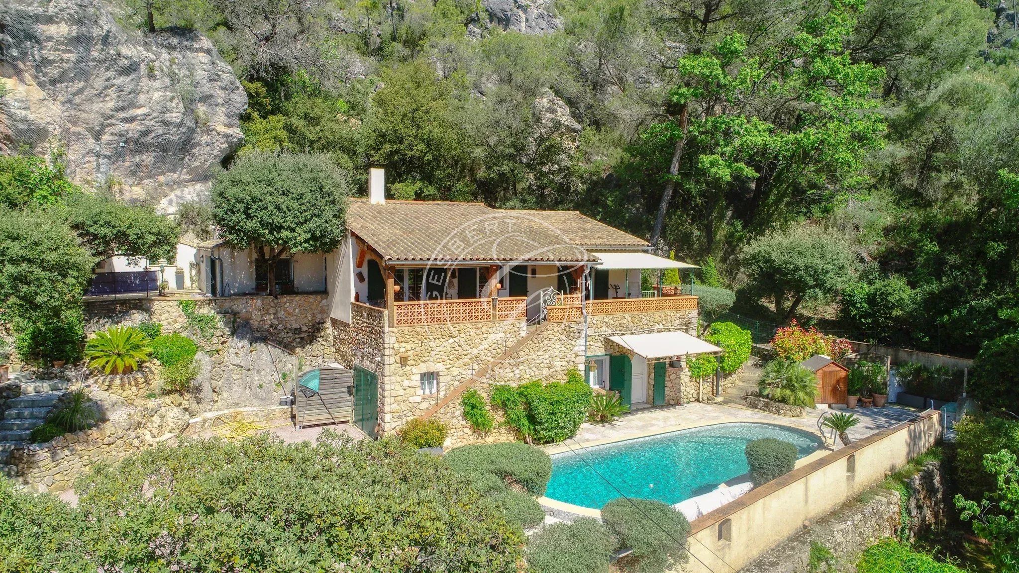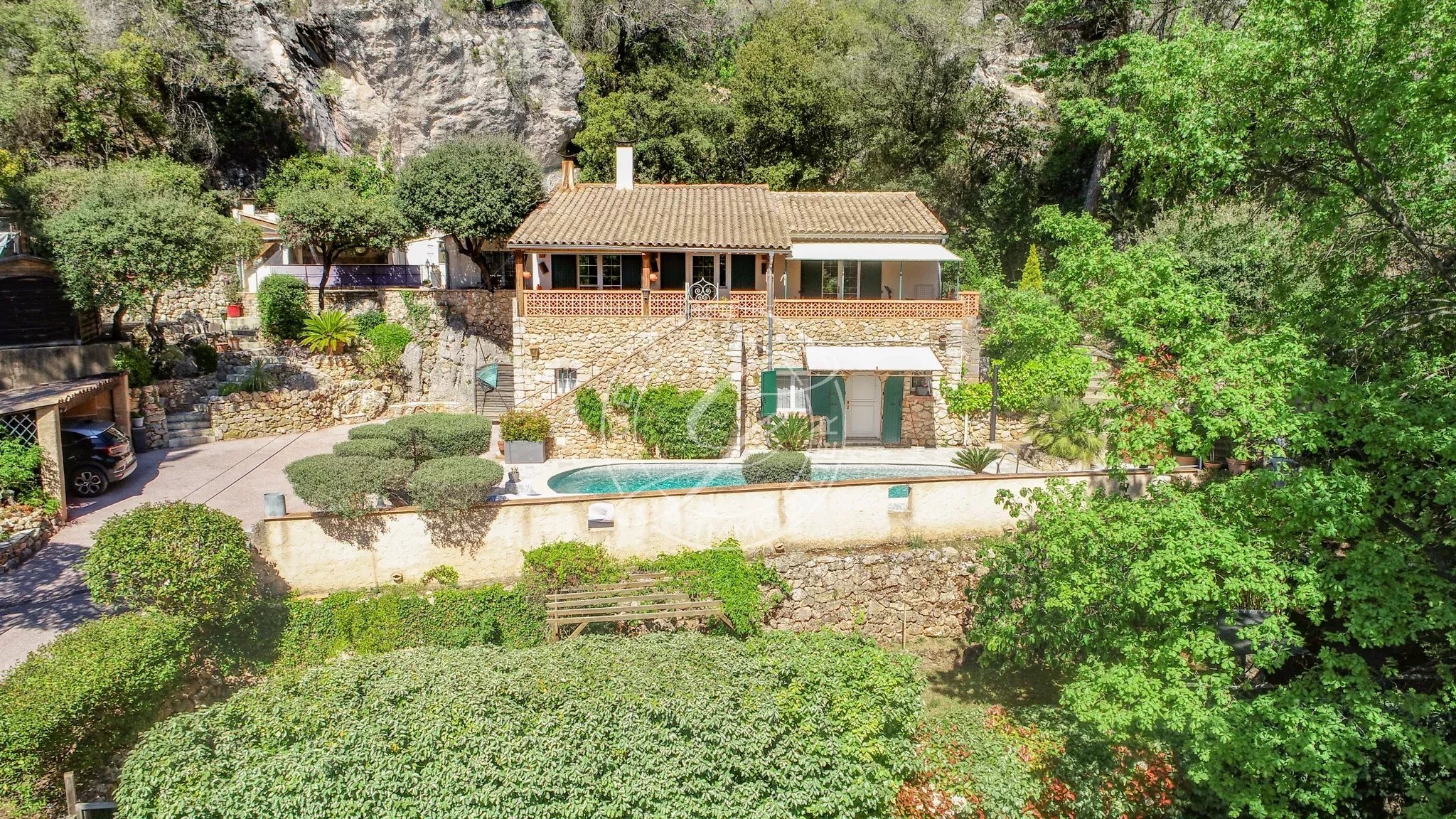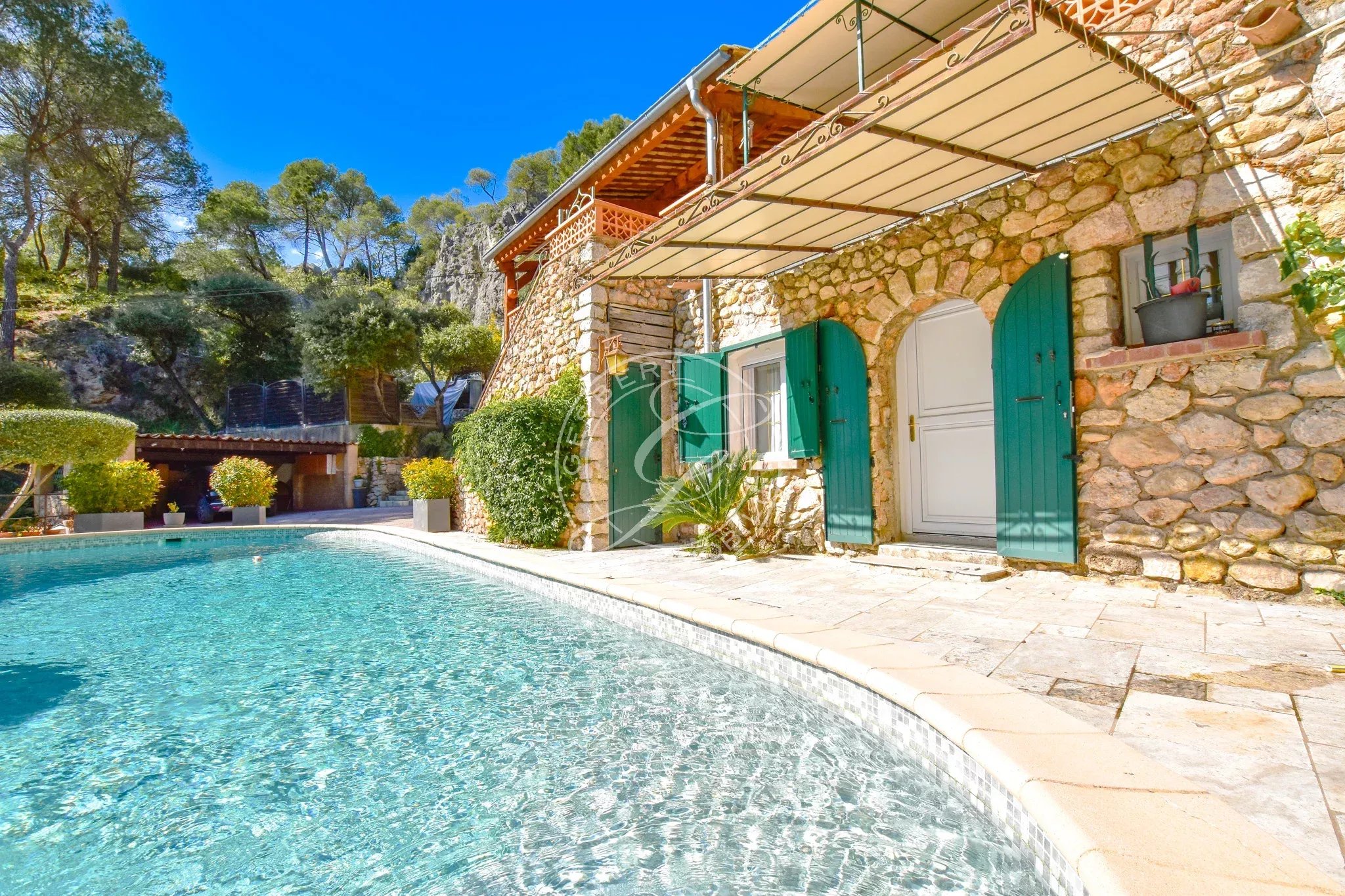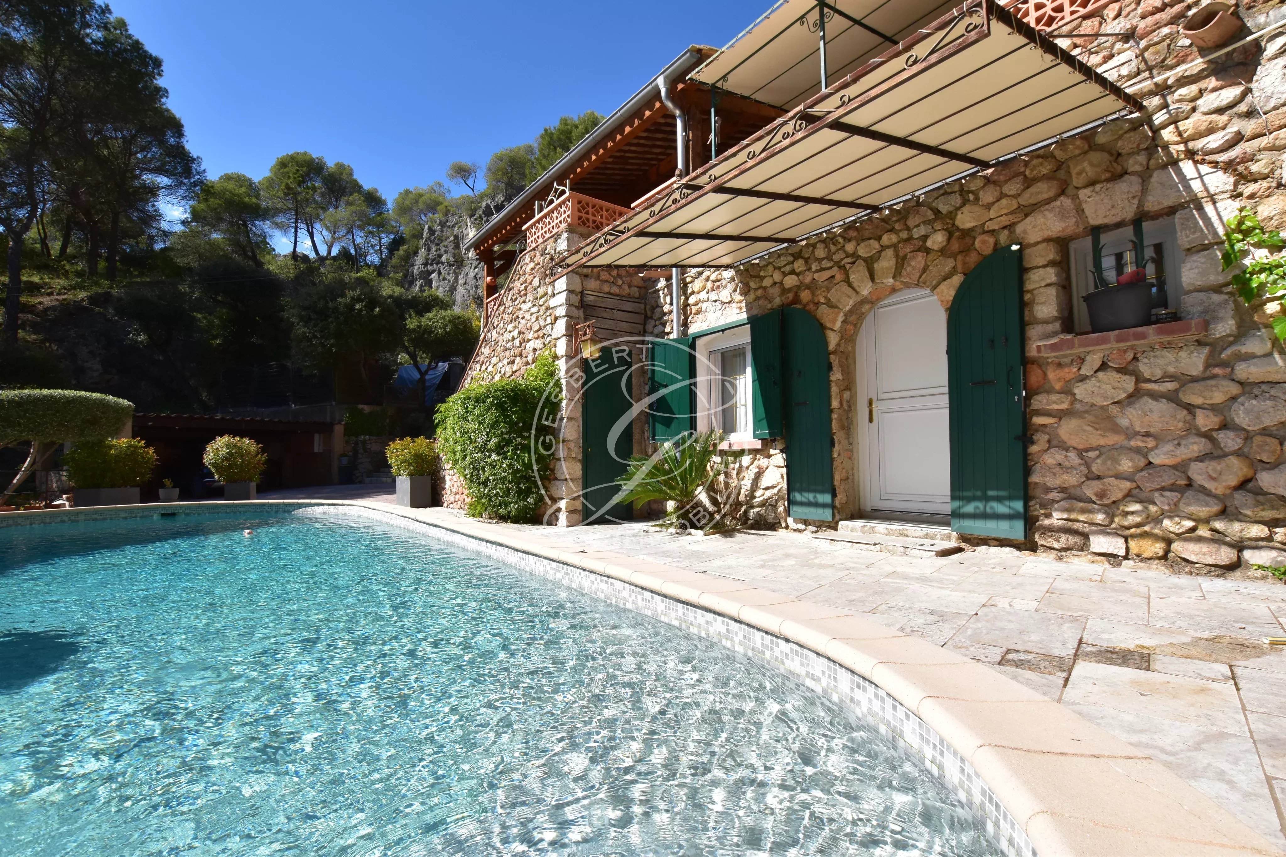 Une piscine traditionnelle en mosaïque, de forme libre, s’intègre parfaitement dans ce décor naturel, accompagnée de son pool house, de plusieurs espaces de rangement fermés, d'un espace de bricolage, d’un cabanon en bois et d’une étonnante grotte aménagée pouvant accueillir différents projets. Un local technique ainsi qu’un espace de détente en contrebas viennent parfaire cet ensemble.