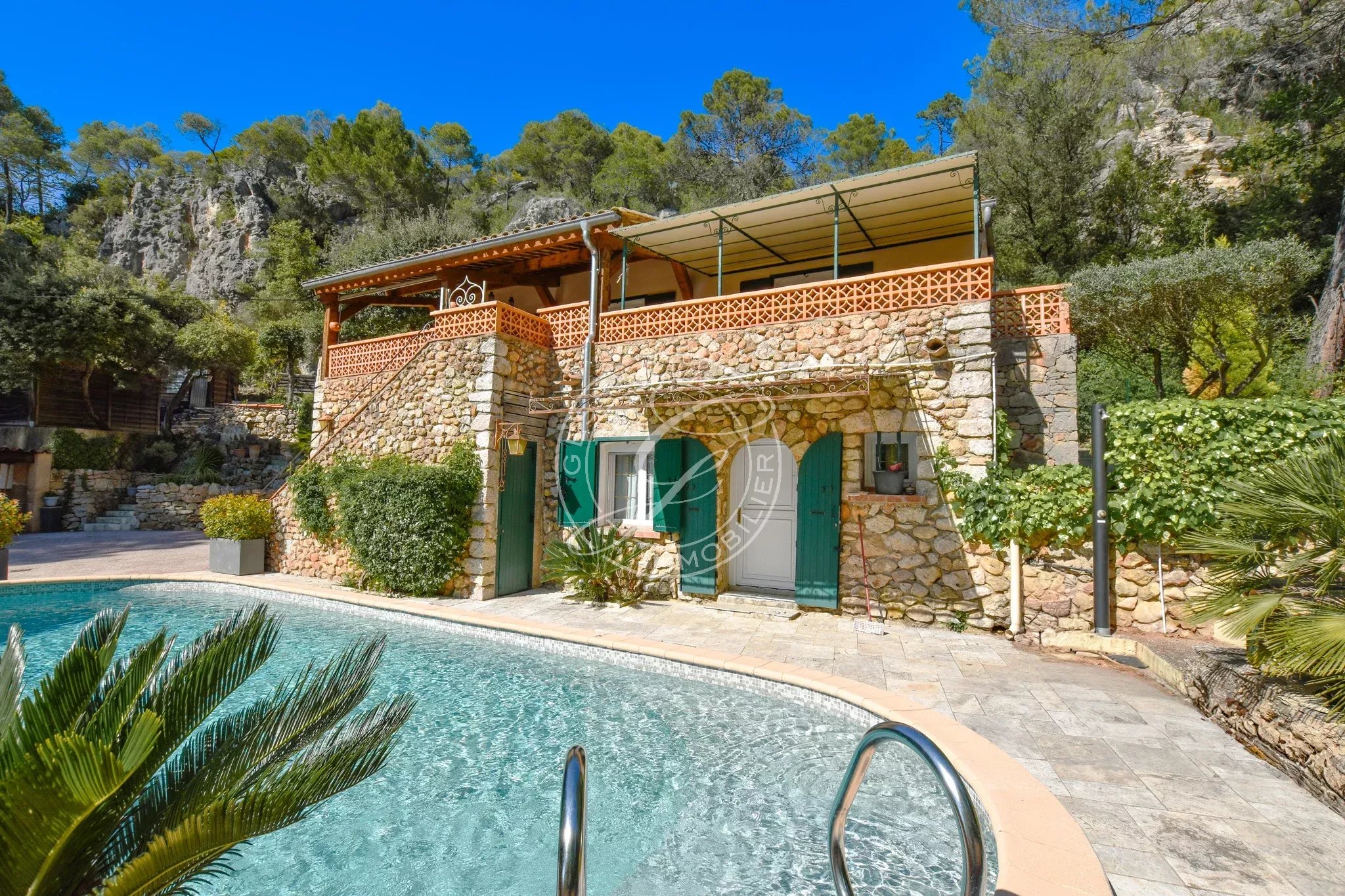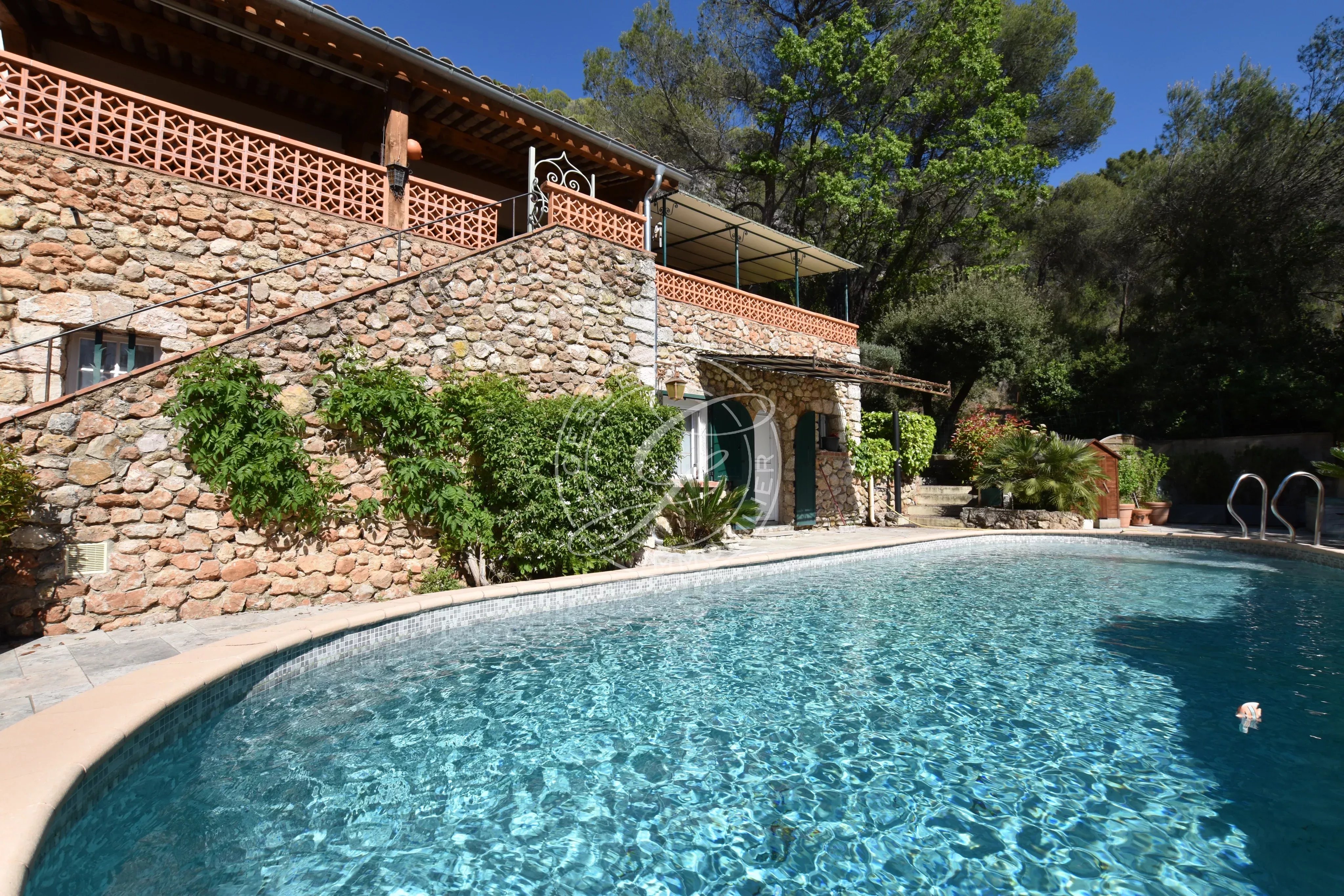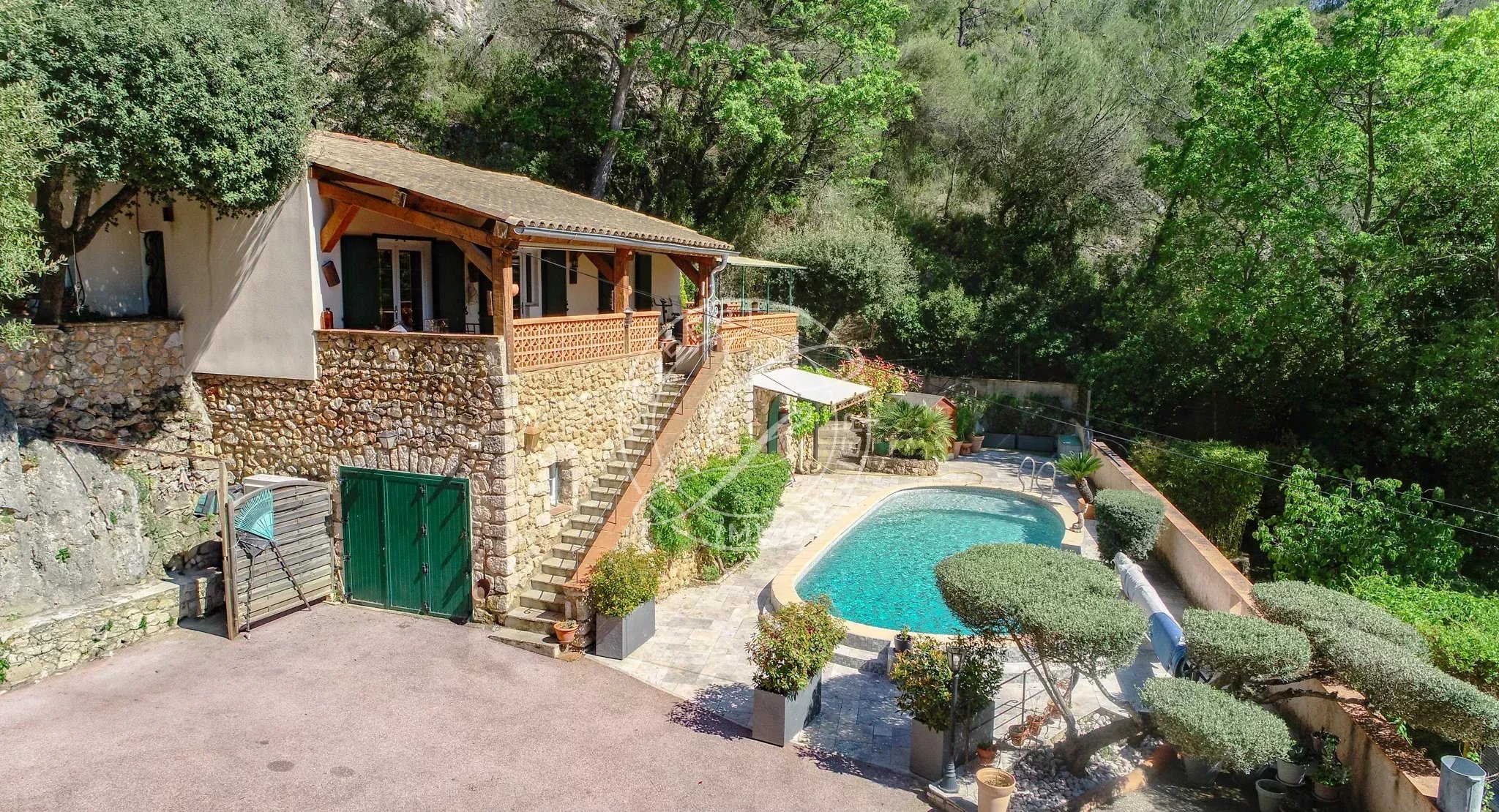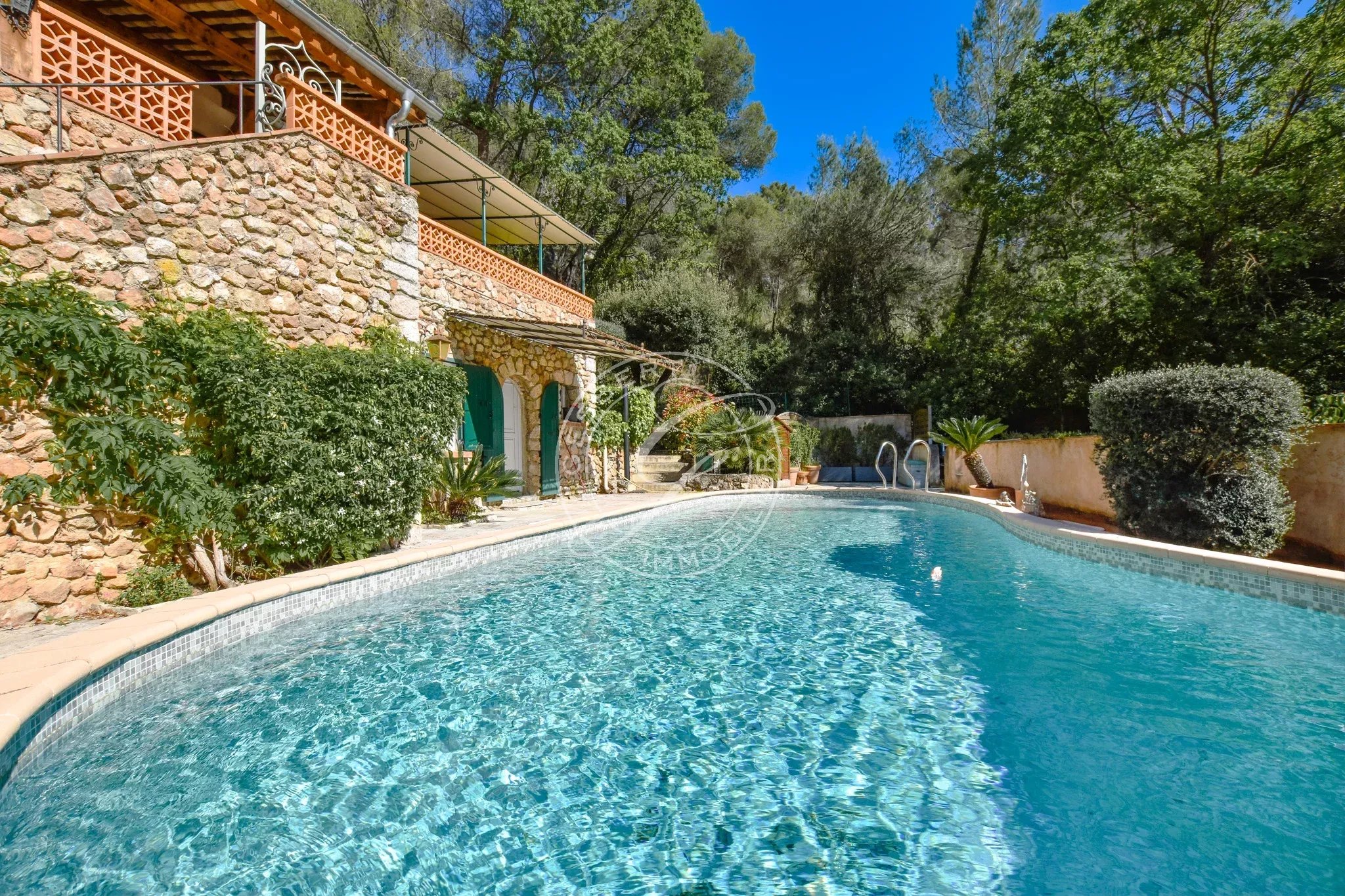 Une piscine traditionnelle en mosaïque, de forme libre, s’intègre parfaitement dans ce décor naturel, accompagnée de son pool house, de plusieurs espaces de rangement fermés, d'un espace de bricolage, d’un cabanon en bois et d’une étonnante grotte aménagée pouvant accueillir différents projets. Un local technique ainsi qu’un espace de détente en contrebas viennent parfaire cet ensemble.