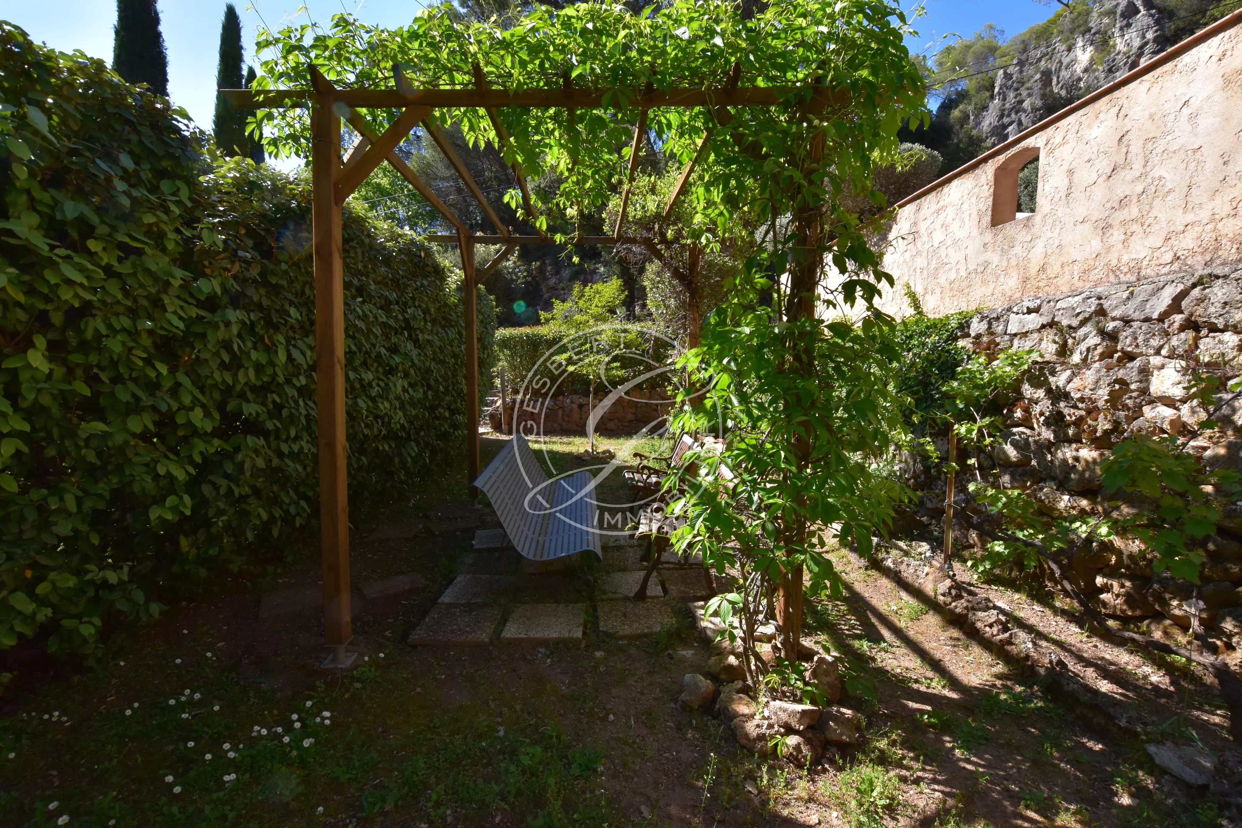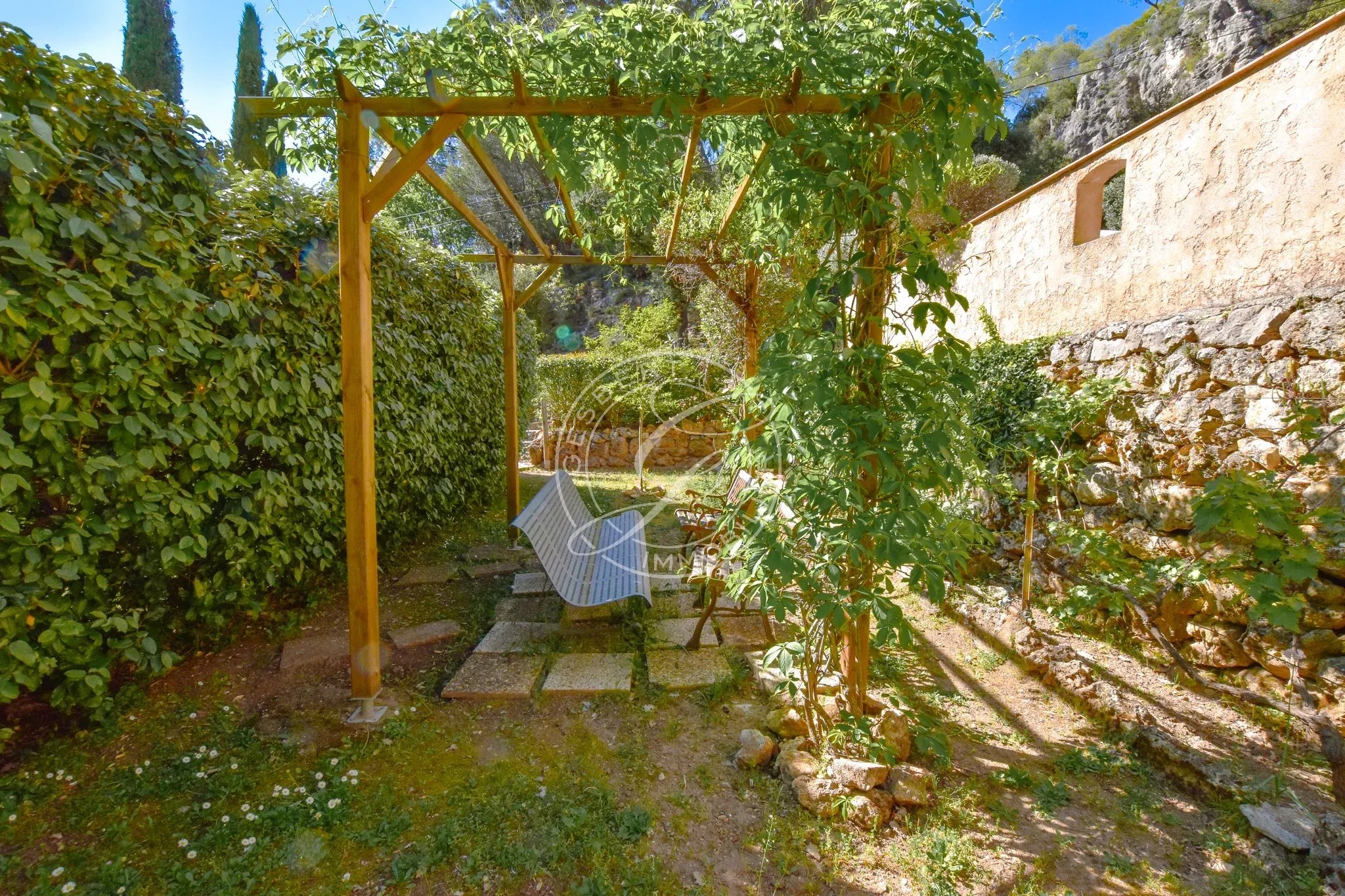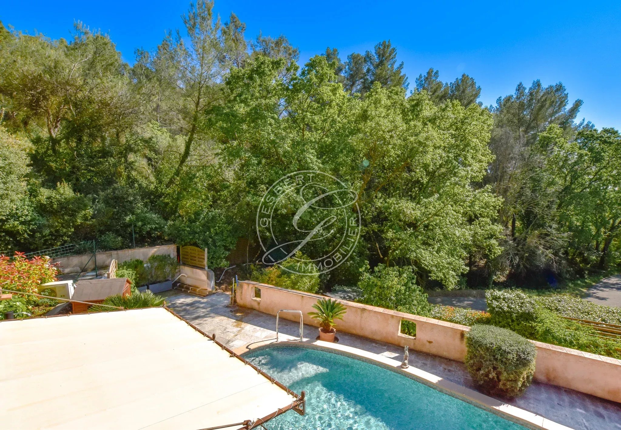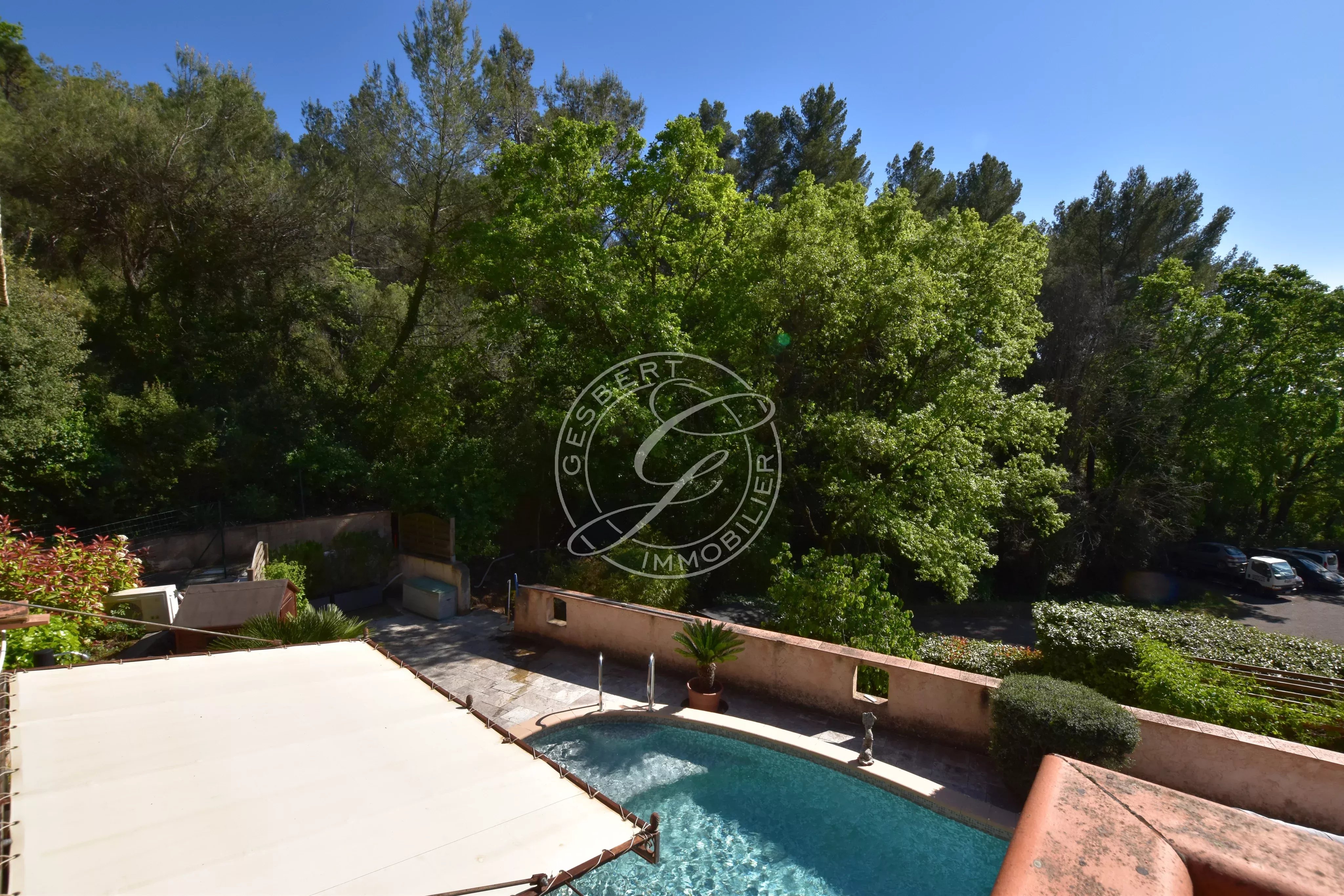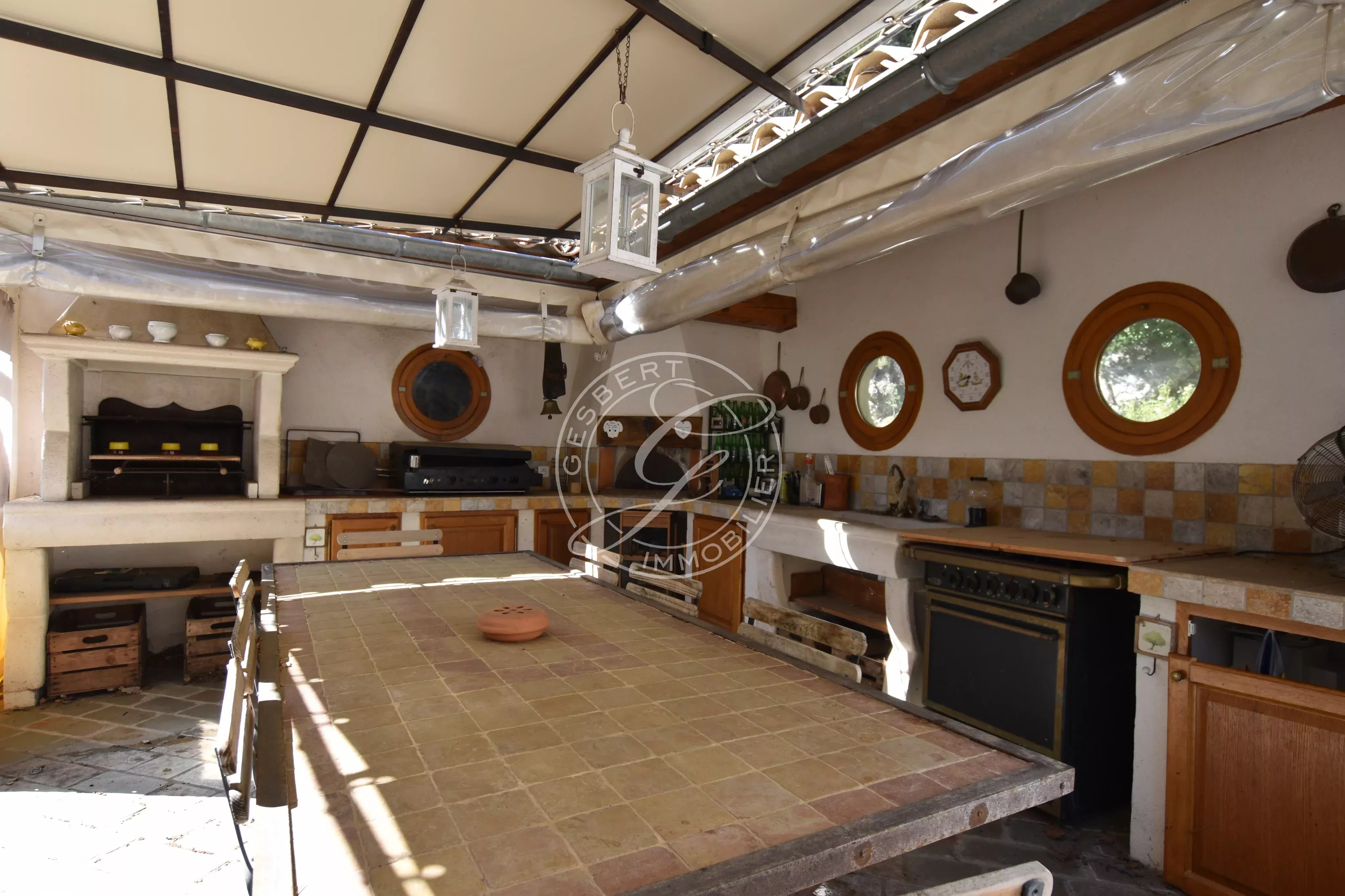 Une piscine traditionnelle en mosaïque, de forme libre, s’intègre parfaitement dans ce décor naturel, accompagnée de son pool house, de plusieurs espaces de rangement fermés, d'un espace de bricolage, d’un cabanon en bois et d’une étonnante grotte aménagée pouvant accueillir différents projets. Un local technique ainsi qu’un espace de détente en contrebas viennent parfaire cet ensemble.